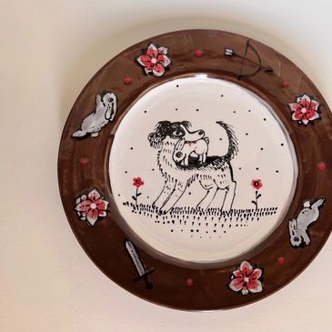 A variety of handmade pieces uniquely painted plates, cups, and more.